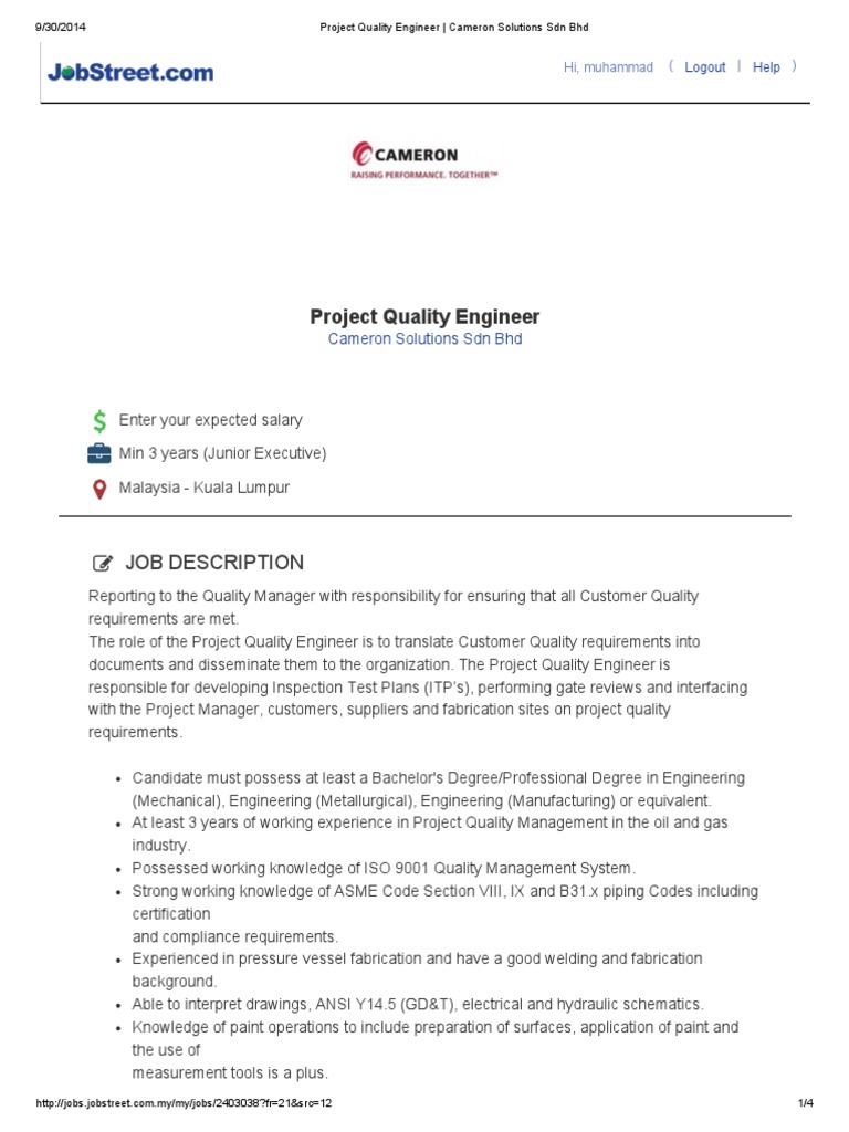 Project Quality Engineer Cameron Solutions Sdn Bhd Employment Technology