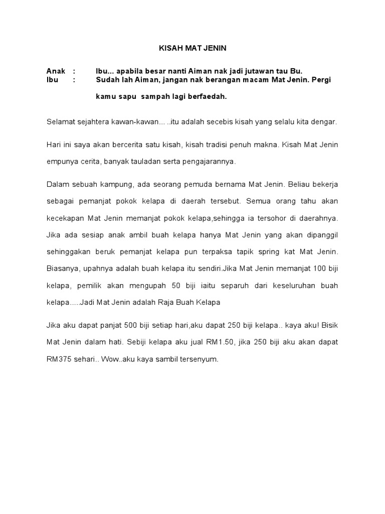 Pada suatu pagi mat jenin memanjat sepuluh batang pokok kepala. Berbalik kepada kisah mat jenin. June 18 2010 at 8 16 pm public.
