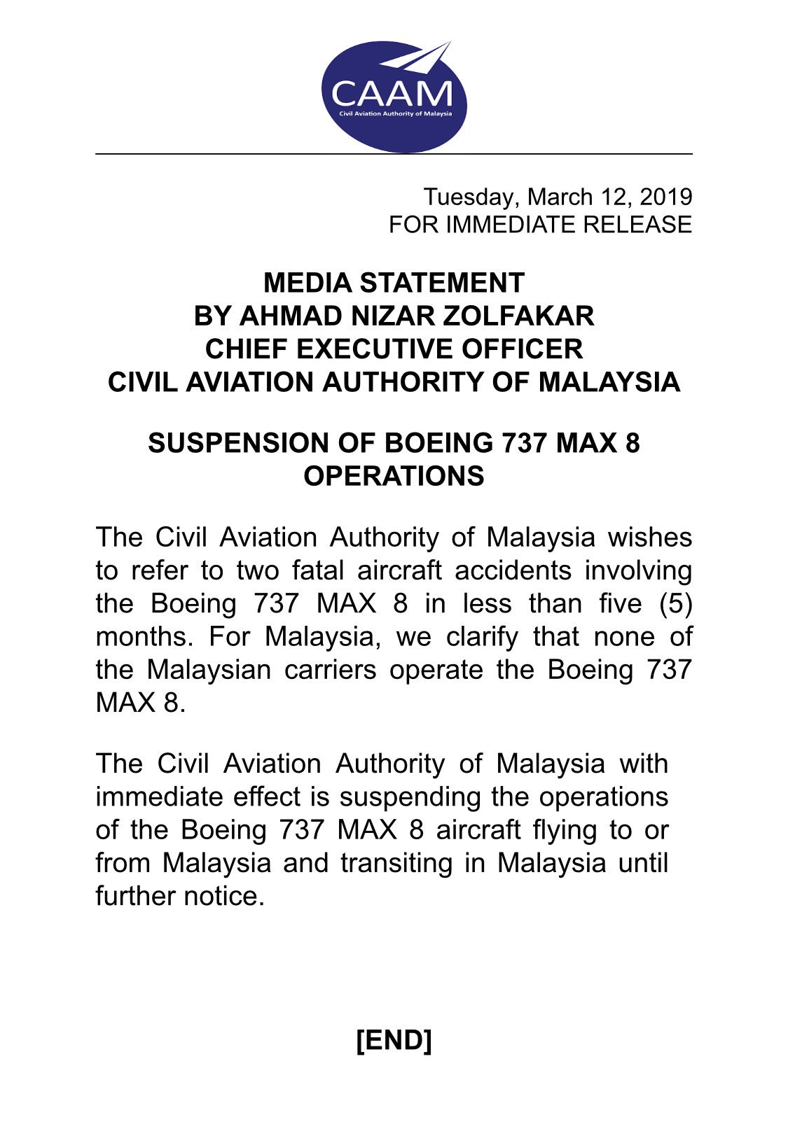 Caa Malaysia On Twitter Suspension Of Boeing 737 Max 8