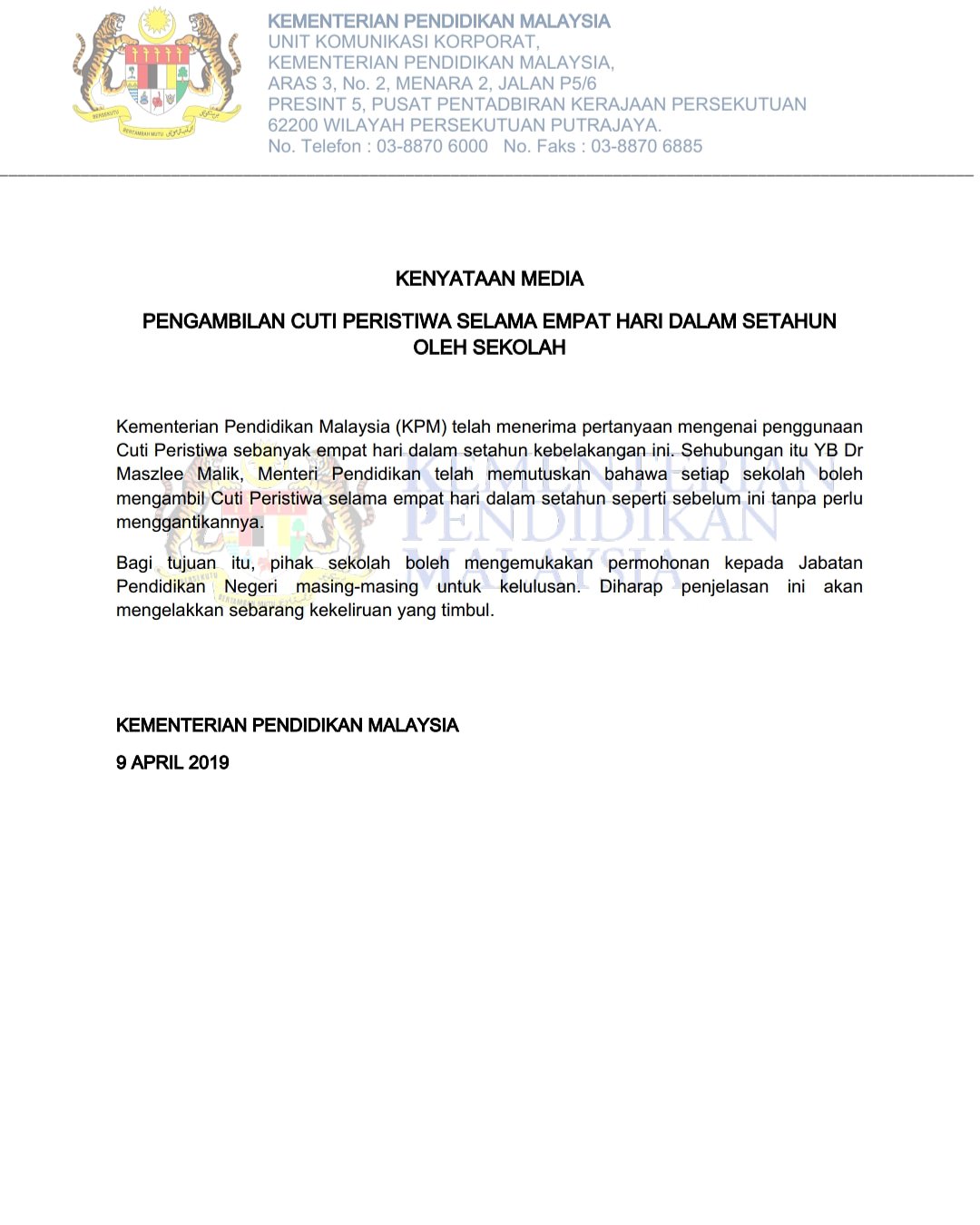 Cuti Perayaan Kpm 2019 Kementerian Pendidikan Malaysia